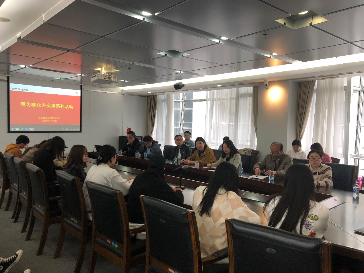 为深入贯彻习近平总书记在党史学习教育动员大会的重要讲话精神,深刻把握习近平新时代中国特色社会主义思想的精神实质、实践要求和为民情怀,进一步增强党员和师生学思践悟新思想的自觉,马克思主义党总支近日开展了“我为群众办实事”教工支部与员工面对面实事工程活动。公司党总支书记戴叶萍,教工第一党支部书记周林、第二党支部书记陆益军、第三党支部书记陈健,以及各教工支部代表教师和公司全体研究生参加此次活动。活动由马克思主义公司党总支书记戴叶萍主持。