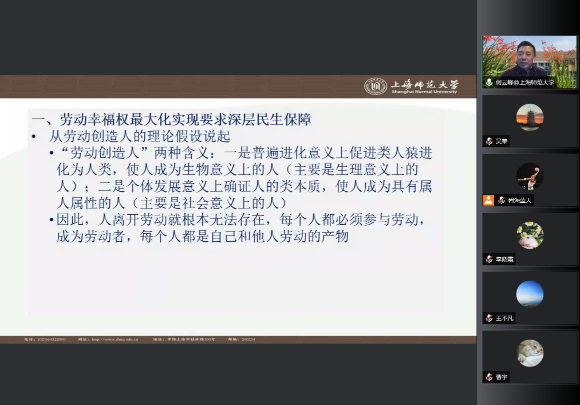 3月18日,在疫情防控的大背景下,williamhill官网网站马克思主义理论与当代实践研究基地坚持积极为师生构筑在线学习和学术交流平台,邀请了上海师范大学何云峰教授作了题为“美好生活、民生保障与劳动幸福权的最大化实现”的学术报告。报告会以腾讯会议在线开展,由williamhill官网网站经理王治东教授主持。