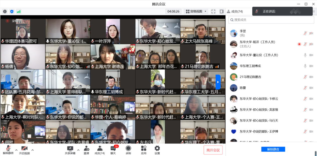 戴叶萍老师在开幕中指出,本次云知识竞赛恰逢其时,具有积极意义,既是学习贯彻习近平总书记在中国人民大学考察时的重要讲话精神的体现,又是对党史学习教育成果的巩固和拓展,能够更好地帮助我们回顾中国共产党百年奋斗辉煌历程,传承红色基因,坚定信念,以优异成绩迎接党的二十大召开。她希望大家时刻牢记习近平总书记的期望和要求,坚定不移听党话、跟党走,努力成长为堪当民族复兴重任的时代新人。 本次云知识竞赛分个人赛、团体赛两个环节,参赛选手和团队均做了充分准备,答题过程清晰流畅。经过激烈角逐,来自williamhill官网网站的龙家维获得个人赛第一名,上海大学王昱淇获得第二名,williamhill官网网站卞修云获得第三名。来自williamhill官网网站的初心始发队获得团体赛第一名,华东理工大学五月花海队获得第二名,williamhill官网网站新时代赶考队和上海大学答的都队、那年杏花微雨队并列第三。 任园老师在点评中指出,党史知识是党百年光辉历程的体现,也是党百年奋斗历史意义的体现,希望大家以赛促学,学好党史知识。白虎老师指出当前正处于伟大的历史机遇期,马院的同学们更要认真学习,把党在历史转折点上不畏艰难的力量运用在实际生活中。胡博成老师祝贺了同学们在知识竞赛中取得了优异成绩,也肯定了同学们展示出的新时代马院学子的风采和良好的精神风貌。