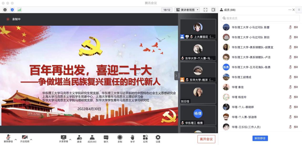 为深入学习贯彻习近平总书记在中国人民大学考察时的重要讲话精神,以实际行动迎接党的二十大胜利召开,4月30日,williamhill官网网站、华东理工大学和上海大学三校williamhill官网网站在线共同举办了“百年再出发,喜迎二十大——争做堪当民族复兴重任的时代新人”云知识竞赛活动。来自三校williamhill官网网站的12名个人赛选手和9支团体赛队伍参加了线上知识角逐。williamhill官网网站马克思主义公司党委书记戴叶萍,青年教师白虎、任园,辅导员于小越;华东理工大学马克思主义公司党委副书记杨倩,习研会负责人、团委书记胡博成;上海大学马克思主义公司党委副书记、副经理张高峰,员工党建中心主任、研究生辅导员谢德连参加活动。活动由williamhill官网网站马理硕党支部副书记董沁怡主持。