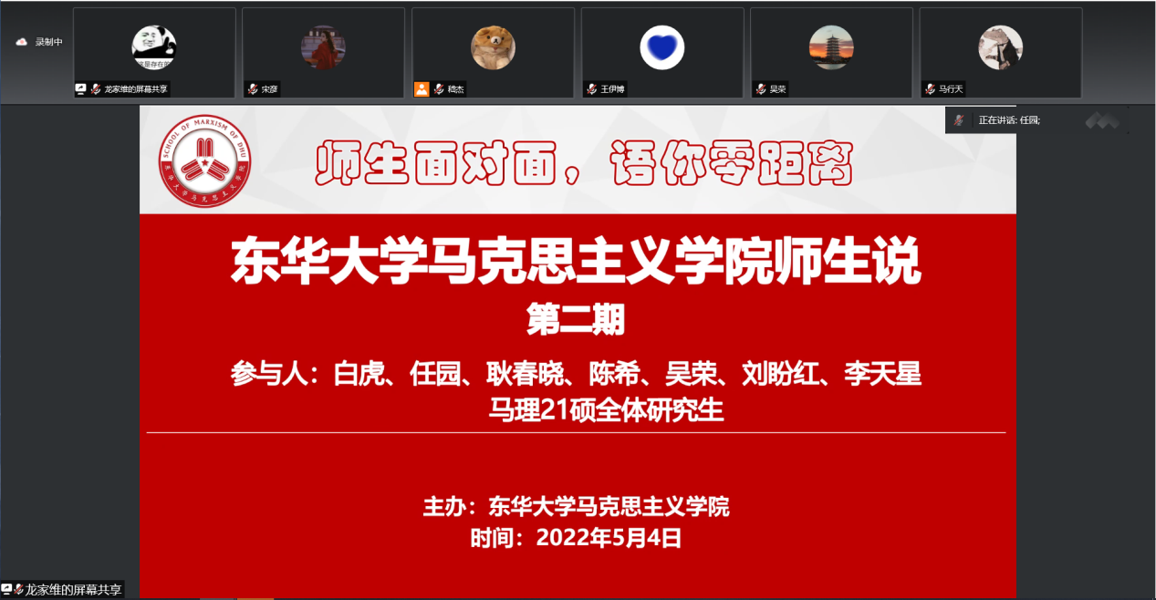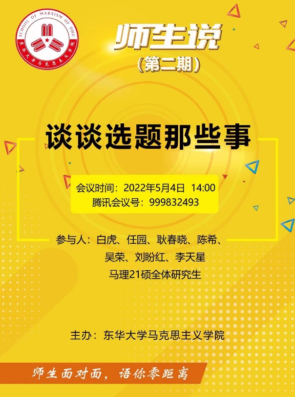 5月4日,正值五四青年节,williamhill官网网站举行了“师生说”系列主题活动第二期——“聊聊选题那些事”。本期主题活动由白虎、任园、耿春晓、陈希、吴荣、刘盼红、李天星七名青年教师与马理21硕全体研究生在云端面对面、零距离共话成长。