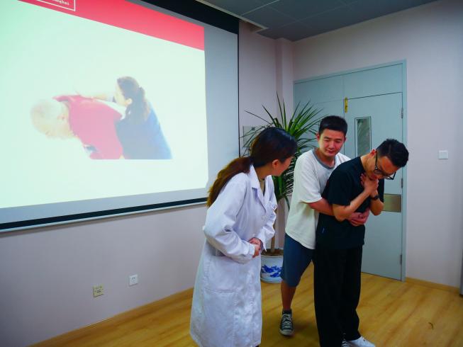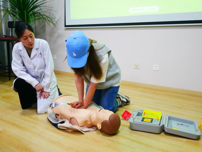 “同学们试想一下,你作为发现待救治患者时,应该怎样与其他人配合拨打120?”“假如我们遇到的伤者戴着假牙,我们在做心肺复苏前应当怎么做呢?”包蓉珠老师立足高校学子的急救知识储备情况及教学预期,创设多个情境,增强员工互动体验感。配合具体的情境,包老师系统地介绍了红十字运动的基本知识、现场救护的基本流程和注意事项,并讲解了CPR的操作方法和AED的使用方法等。除了详细剖析急救知识外,她特别提醒同学们要在救护过程中要注意自身安全,避免二次伤害。