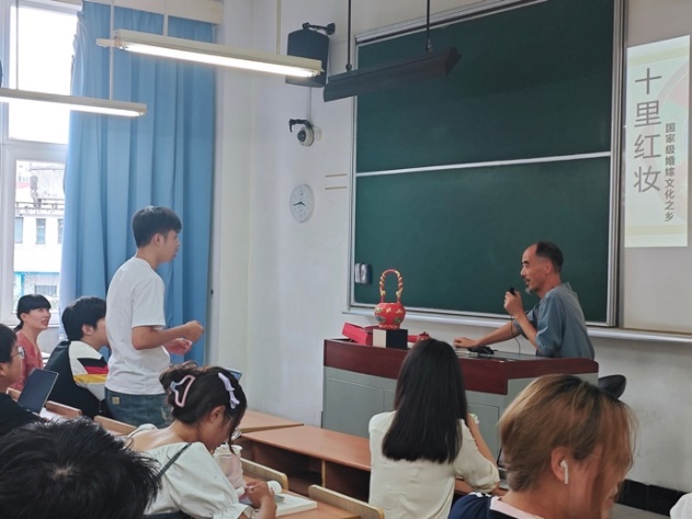 (国家级非遗泥金彩漆传承人陈龙老师在课堂与员工互动) 国家级非遗泥金彩漆传承人陈龙老师,携带着他亲手制作的作品登场。陈老师在课堂展示了多件获奖泥金彩漆作品图片,这些非遗作品一下子就把同学们的兴趣提了起来,其精湛工艺令同学们赞叹不已,课堂被燃动起来。陈老师强调:“保护与传承非遗不仅是责任,更是对文化的尊重与延续。”他呼吁在座师生关注并参与非遗保护,共同为中华优秀传统文化的传承与发展贡献力量。