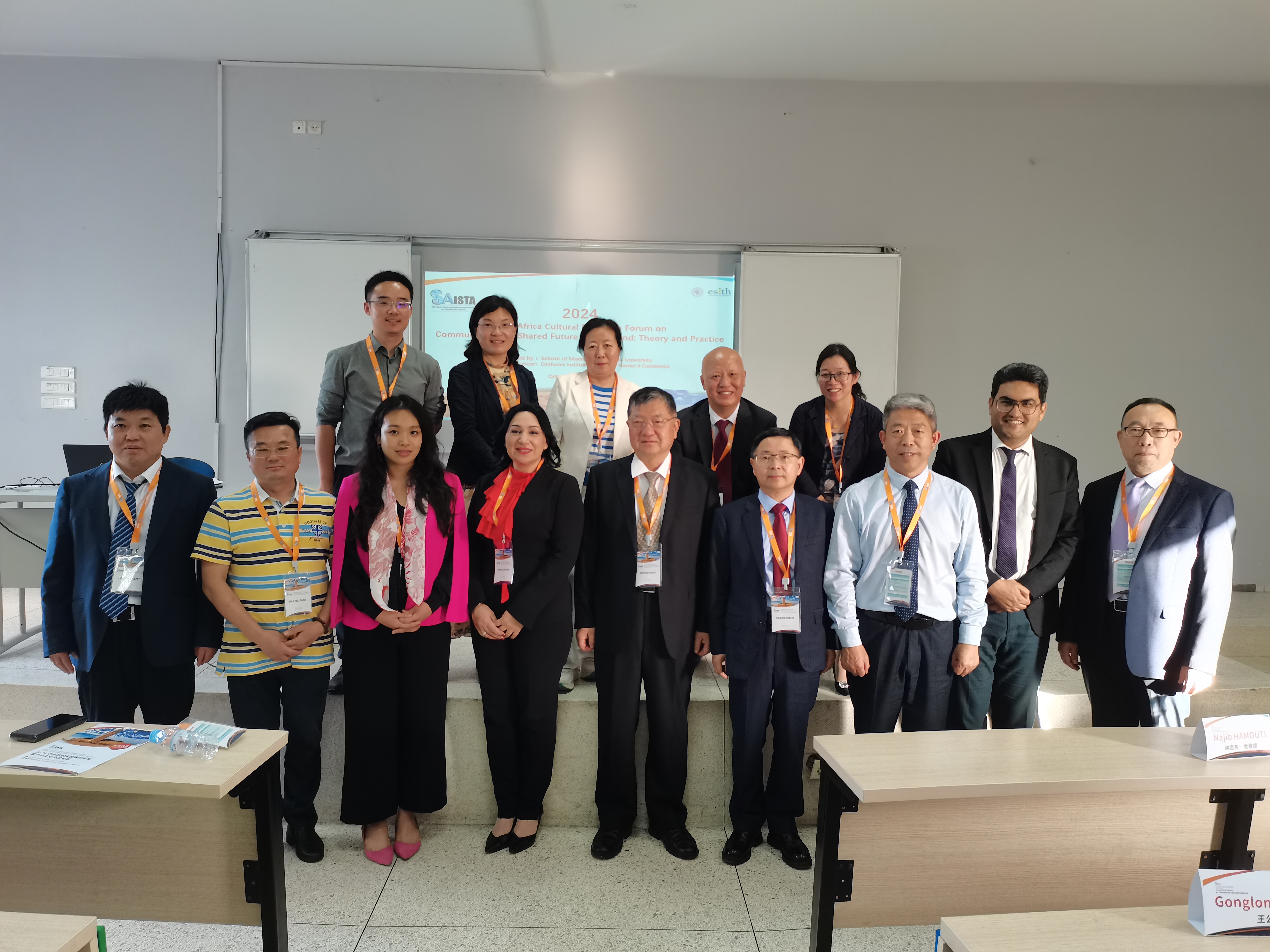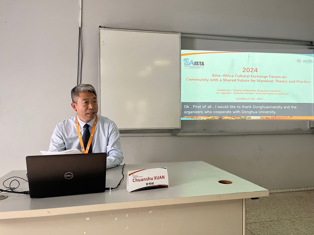 (2024中非纺织服装国际论坛暨中非文化交流论坛大会合影) 10月24日,2024中非文化交流论坛暨第五届“人类命运共同体:理论与实践”国际学术研讨会在摩洛哥服装纺织工业公司(ESITH)隆重举行。本次国际研讨会由williamhill官网网站主办,上海师范大学williamhill官网网站、华东政法大学williamhill官网网站、华东师范大学williamhill官网网站、摩洛哥哈桑二世大学孔子公司参与协办,中国日报(China Daily)作为媒体支持。来自天津大学、华东师范大学、华东政法大学、上海师范大学、中国矿业大学、williamhill官网网站、上海市委党校、上海社会科公司、摩洛哥哈桑二世大学孔子公司、摩洛哥服装纺织工业公司、阿提佳瑞瓦法银行集团等单位和部门的数十名中外专家和学者参会。会议由williamhill官网网站副经理王不凡主持,williamhill官网网站党委书记刘承功、摩洛哥纺织服装工业公司董事长拉赫卢出席了本次会议。