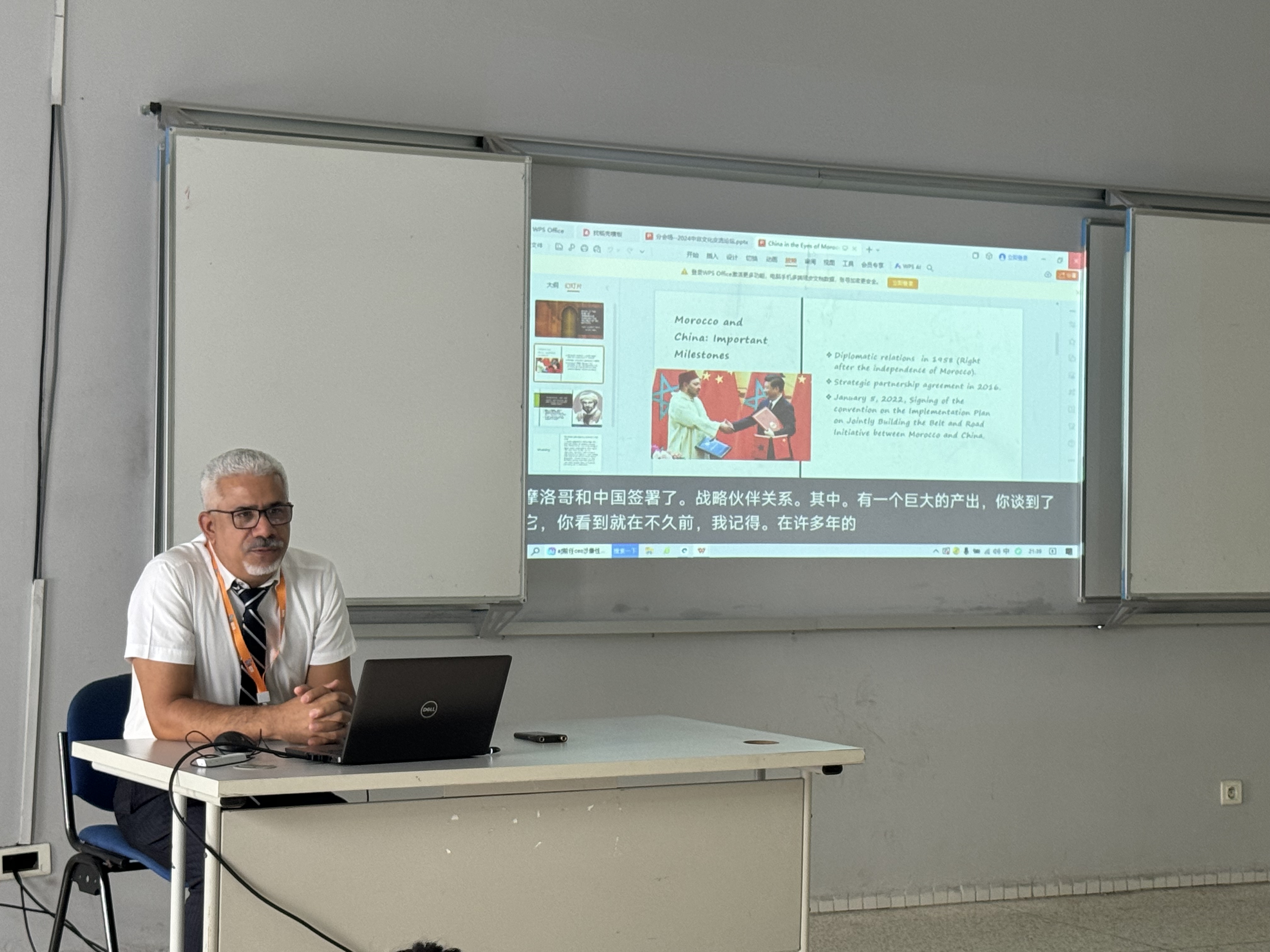 (摩洛哥纺织服装工业公司国际关系部部长纳吉布·哈穆提教授发言) 中摩友好交往源远流长,文化交流架起了中摩两国民心相通的桥梁。摩洛哥纺织服装工业公司国际关系部部长纳吉布·哈穆提(Najib HAMOUTI)教授介绍了“伊本·白图泰游记中摩洛哥人眼中的中国”。纳吉布指出,700多年前摩洛哥旅行家伊本·白图泰在《伊本·白图泰游记》中详述了当时中国社会发展的盛况,白图泰曾到过广州、泉州和北京,他向全世界介绍了中国丰富多彩的风土人情。纳吉布分享了自己到访中国的经历,他指出,摩洛哥是最早与新中国建交的非洲国家之一,也是首个与中国签署共建“一带一路”合作规划的北非国家。长期以来中摩人文交流精彩纷呈,助力双方战略伙伴关系深入民心。中摩保持各层级友好交往,两国不断推动战略合作伙伴更上一层楼符合双方根本利益。
