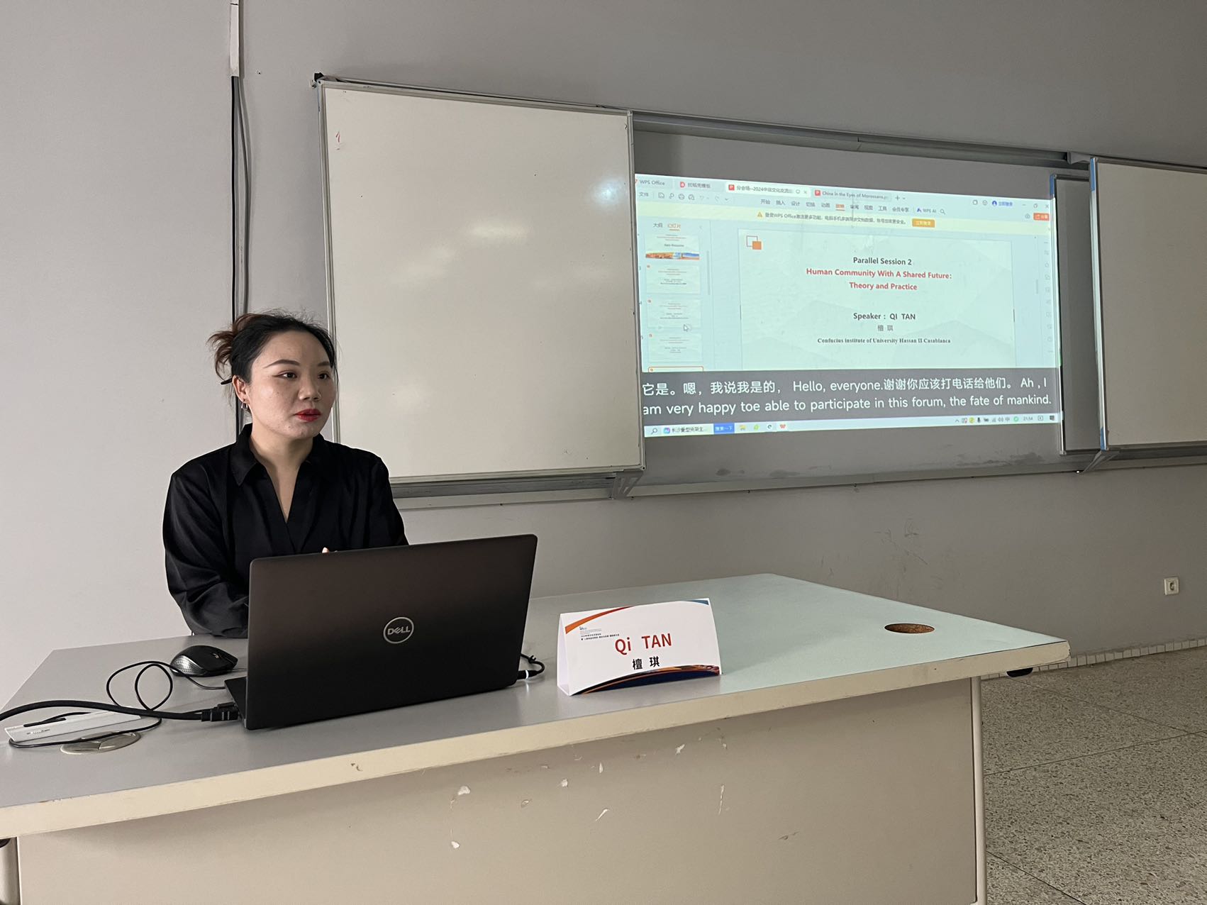 (摩洛哥哈桑二世大学孔子公司教师檀琪发言) 同行参会的孔子公司教师檀琪分享了她的教学经历。据檀琪介绍,摩洛哥哈桑二世大学孔子公司提供丰富的文化活动,每年举办相关活动数十场。特色品牌项目包括 “伊本·白图泰”杯系列比赛”(包含书法、朗诵、演讲、唱歌等项目)、“风从东方来”文化大篷车、春节联欢活动等。活动面向摩洛哥公众,在当地形成了良好口碑。