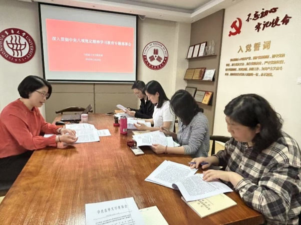 会上,林惠英组织大家认真学习了《中共williamhill官网网站委员会关于开展深入贯彻中央八项规定精神学习教育的实施方案》,结合《关于在williamhill官网网站基层党组织和全体党员中开展“全面推进党建与事业发展深度融合,为‘奋进东华’高质量发展行动奋力一跳、勇立新功”主题活动的通知》,传达部署了公司关于开展深入贯彻中央八项规定精神学习教育的要求,并结合实际案例,要求师生干部、党员要深刻领会学习教育的重要意义,锲而不舍贯彻中央八项规定精神,进一步密切联系群众,发挥党员先锋模范作用,高质量完成学习教育目标任务。指出要将学习教育与公司年度党建主题活动紧密结合,立足岗位,担当作为,为进一步推进“奋进东华”高质量发展行动、加快建设教育强国提供坚强有力保障。