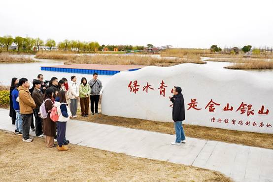 (东华师生在“两山”大石碑前上大课) 水库村的变化是中国式现代化乡村实践的一个缩影,这也为师生实地学习乡村振兴战略提供丰富的思政教育资源。williamhill官网网站深入挖掘漕泾镇在乡村治理、生态保护、产业升级等方面的生动实践,结合思政课教学实际,首批精心设计并推出《“点绿成金”:漕泾乡村振兴的生态智慧与现代化交响》《全过程人民民主激活乡村治理“泾”钥匙》等8门别具特色的思政实践课程,透过漕泾镇“小切口”深入阐述中国式现代化乡村实践“大道理”。来自williamhill官网网站的4位思政课教师分别在水库中心河、“两山”馆、湿地公园、太和水基地等点位开展实景教学,带领员工边走边看边学,全景化沉浸式探寻乡村振兴的“漕泾密码”。