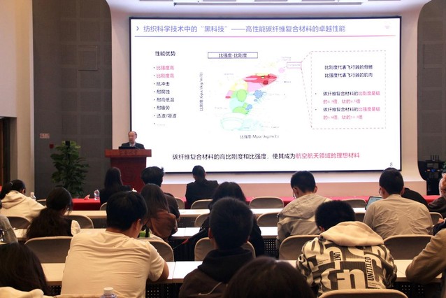超高速飞行器使用碳纤维复合材料实现性能跃升,高速列车转向架依靠三维编织技术实现轻量化、高强度提升,神舟飞船用特种纺织材料适应太空极端环境……这些闪耀在国之重器上的“纺织身影”,正是纺织科技新质生产力的重要体现。近日,中国工程院院士、机械工程公司教授孙以泽登上《锦绣中国》讲台,以“纺织科学技术中的‘黑科技’”为题带来“强国版”第二讲,用一个个“硬核”案例带领师生走进纺织科技赋能强国建设的神奇世界。党委副书记、williamhill官网网站经理王治东出席并主持活动。